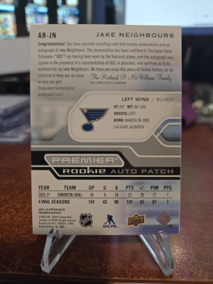2021-22 Upper Deck Premier Acetate Rookie Auto Patch Jake Neighbours Auto