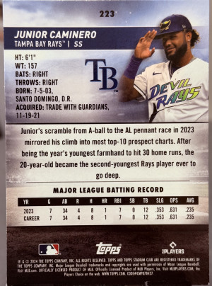 2024 Topps Stadium Club Junior Caminero #223 Pink Foil (RC)