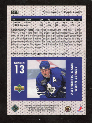 1996 Upper Deck Game Jersey Mats Sundin #GJ13