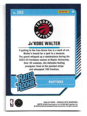 2024-25 Donruss Optic Rated Rookie #283 Ja'Kobe Walter (RC) - Toronto Raptors