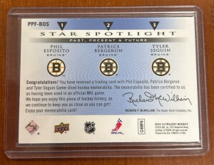 Phil Esposito/Patrice Bergeron/Tyler Seguin Triple Jersey Card