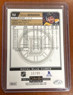 Patrice Bergeron OPC Platinum Royal Blue Cubes 13/99