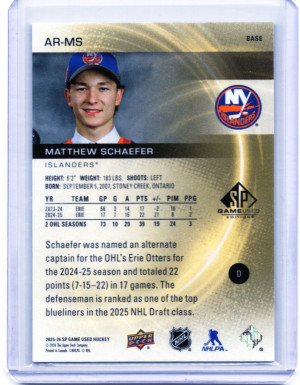 Matthew Schaefer RC 2025-26 Upper Deck SP Game Used #AR-MS Authentic Rookies