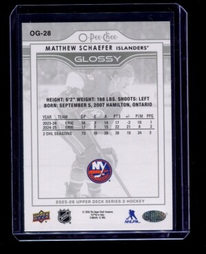 2025-26 UPPER DECK SERIES 2 MATTHEW SCHAEFER O-PEE-CHEE GLOSSY ROOKIE SILVER